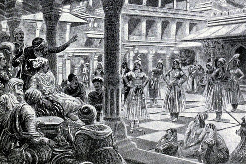 The game of Pachisi was played by Akbar in a truly regal manner. The Court itself, divided into red and white squares, being the board, and an enormous stone raised on four feet, representing the central point. It was here that Akbar and his courtiers played this game; sixteen young slaves from the harem wearing the players’ colours, represented the pieces, and moved to the squares according to the throw of the dice. It is said that the Emperor took such a fancy to playing the game on this grand scale that he had a court for pachisi constructed in all his palaces, and traces of such are still visible at Agra and Allahabad.